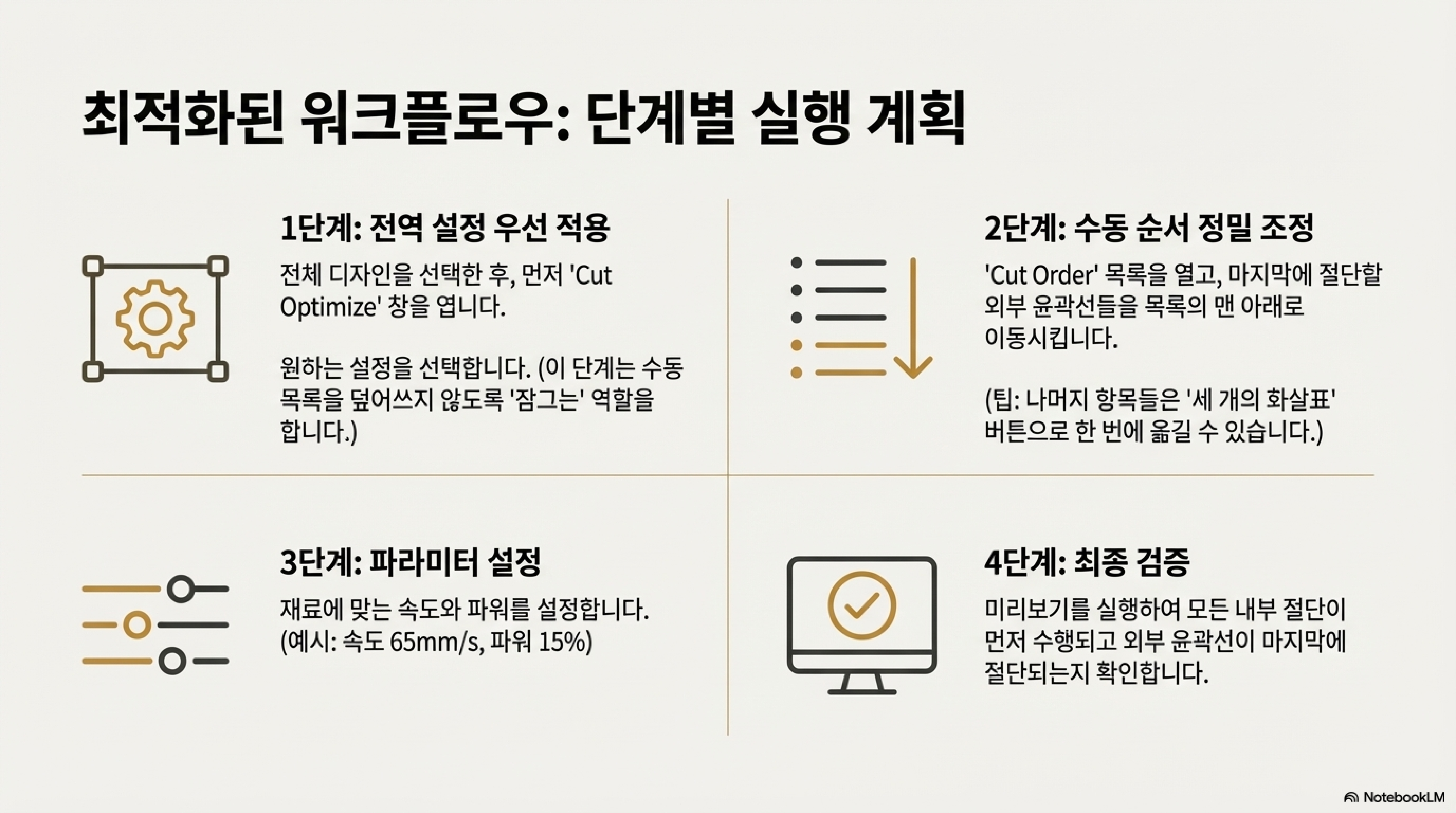 이를 위해 가장 논리적인 단계는 절단 목록을 수동으로 재정렬하여 네 개의 외곽선을 목록의 맨 끝으로 옮기는 것이었습니다. 모든 것이 완벽해 보였습니다. 하지만 미리보기 화면을 실행하자마자 기계는 제 의도를 완전히 무시하고 작업 초반에 외곽선 조각부터 잘라내기 시작했습니다. 목록은 분명 완벽했는데, 왜 기계는 제멋대로 움직이는 걸까요? 한참을 헤맨 끝에 어이없는 곳에서 답을 찾았습니다.
